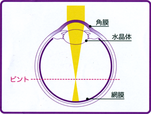 近視とは、角膜から網膜までの距離が長くなったり、角膜や水晶体の屈折率が変化することで、網膜の手前でピントが合ってしまう屈折異常のことです。
